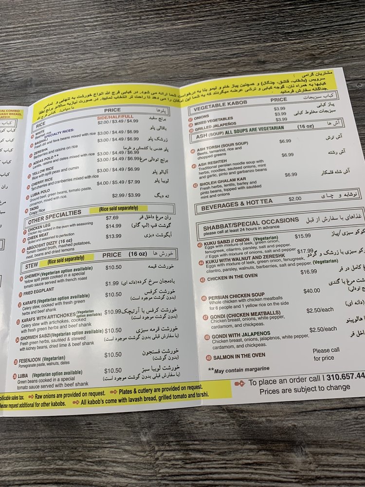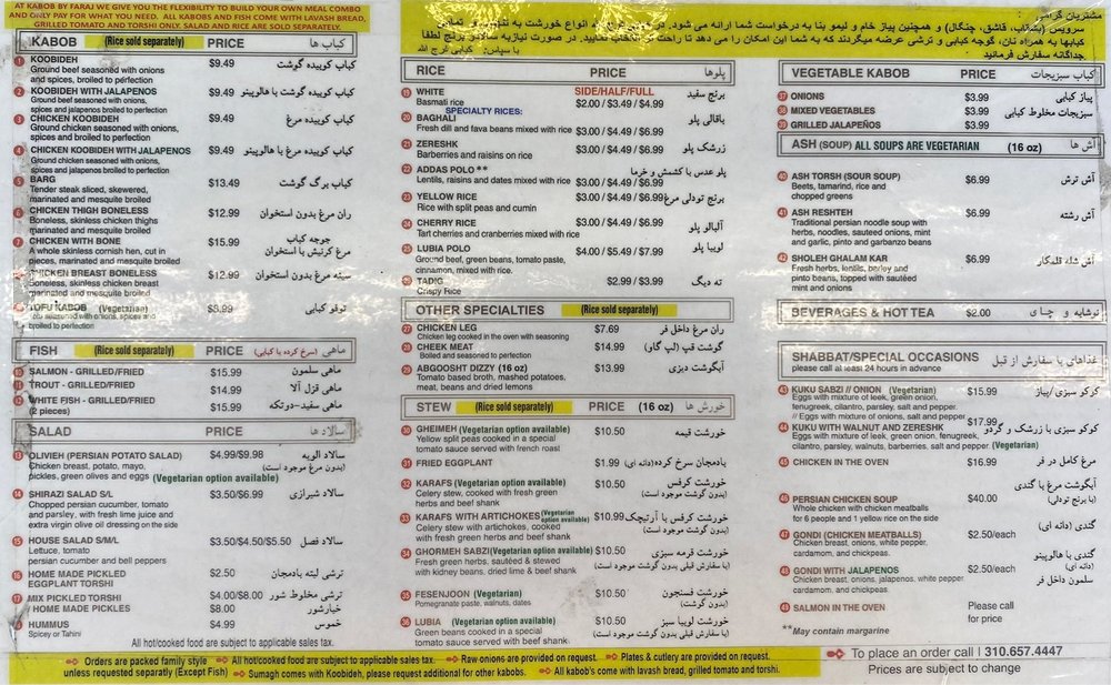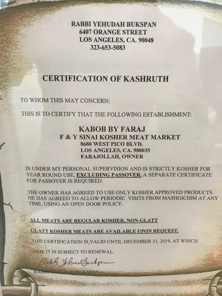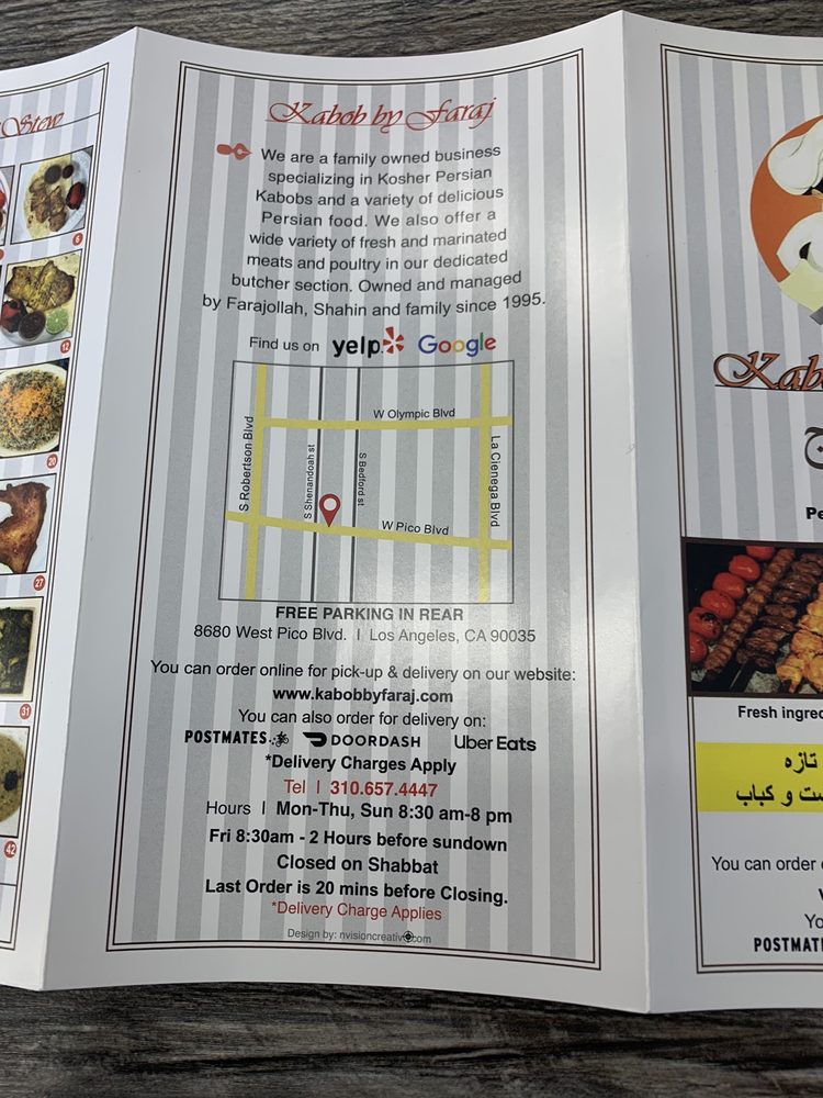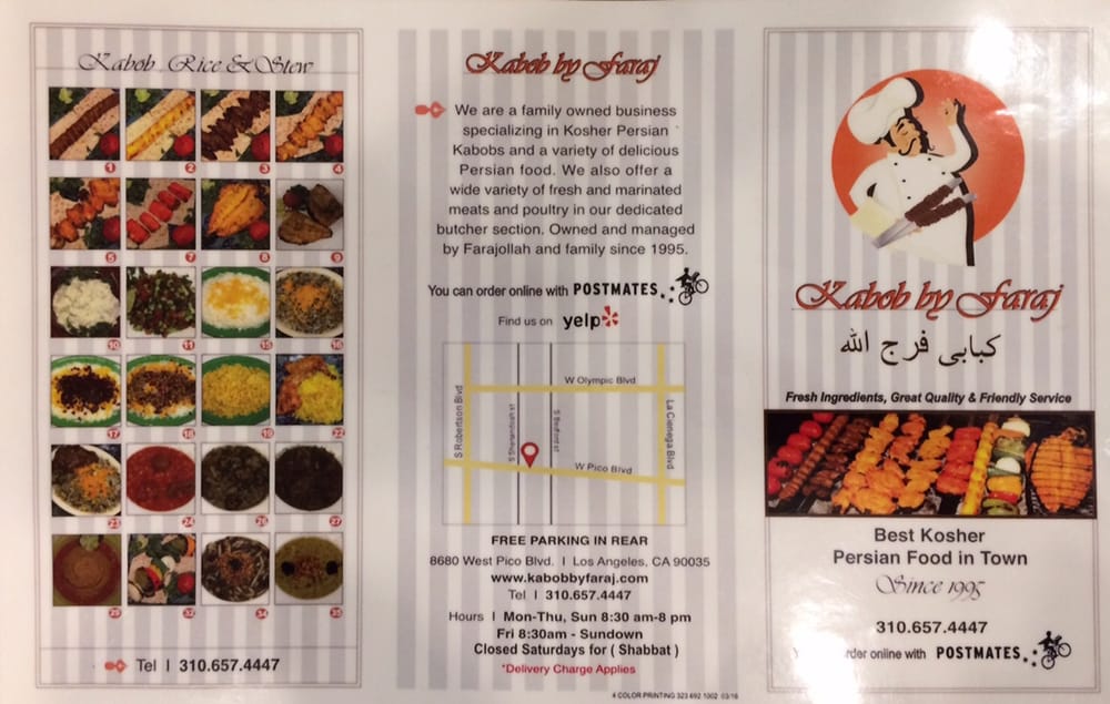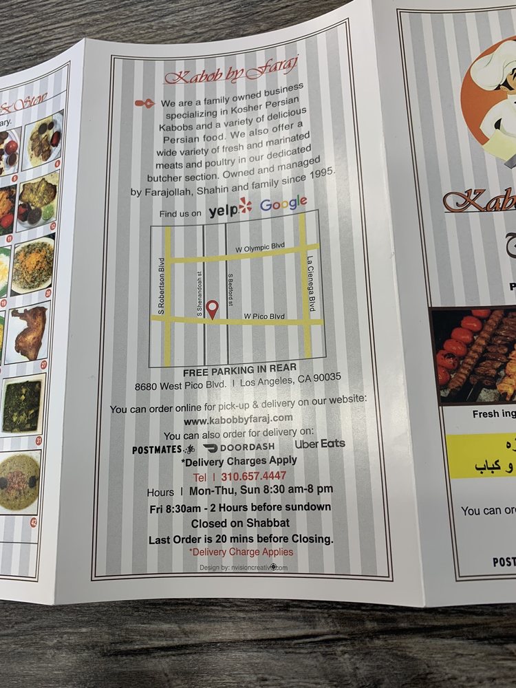 Kabob By Faraj Restaurant & Kosher Meat Market, located at 8680 W Pico Blvd Los Angeles, CA, offers a unique dining experience combining a restaurant and a kosher meat market. The menu features delicious Persian dishes like koobideh, Shirazi, Persian rice, stewed green beans, chicken kobediah, and savory beef kabobs. Customers rave about the fantastic food, friendly service, and cozy atmosphere inside the kosher butcher shop. With a diverse range of options and accommodating staff, Kabob By Faraj is a must-visit for anyone craving top-quality Iranian kabobs in the area. Don't miss out on the flavorful soups, fresh fruit accompaniments, and the unique dining experience this place has to offer.